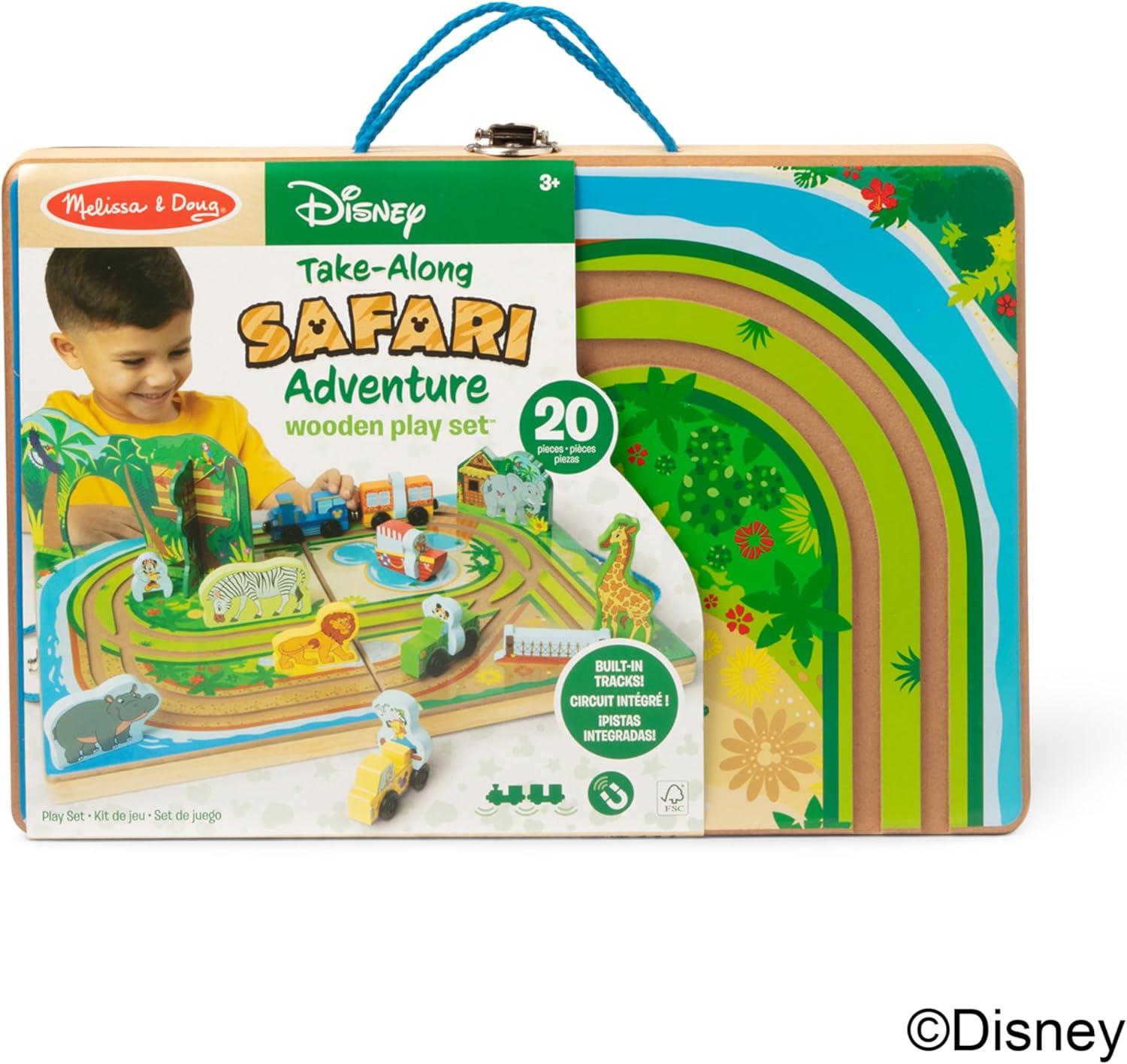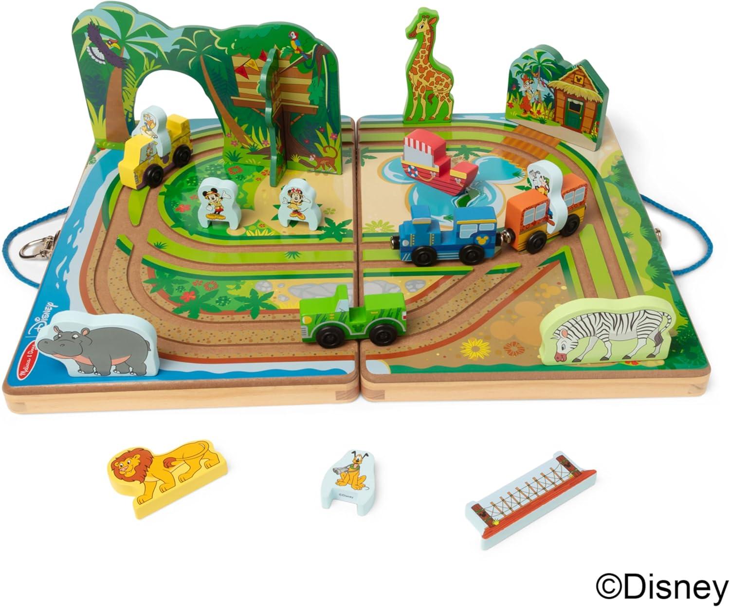 Built-in tracks, colorful Disney safari park-inspired scenery, and fun play pieces, like Disney’s Mickey Mouse and friends, let kids take their imaginations for a spin . . . and take playtime anywhere they want to go! Unfold the sturdy wooden case to create an illustrated play surface with built-in road tracks for the two magnetic wooden trains and two wheeled vehicles the play pieces can ride on. There’s even a wooden boat for exploring the lagoon! Set up a jungle tunnel, a rope bridge, and a safari station hut! Wooden play pieces include Disney’s Mickey Mouse and friends, as well as chunky animals to discover and to enhance imaginative storytelling. All the pieces store in the fold-up case with convenient carrying handle for easy cleanup and travel (there’s plenty of room to add other toys, too!). Keep playtime rolling for kids three and older and encourage independent play and motor skill development. This product is certified by the Forest Stewardship Council. FSC certification ensures that products come from responsibly managed forests that provide environmental, social, and economic benefits, and that forests are protected for future generations. Please note that FSC certification applies to new inventory only (FSC C156584)