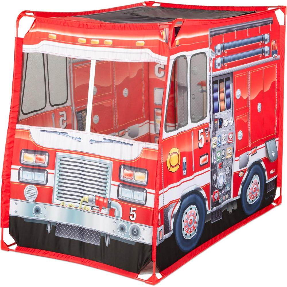 There’s plenty of room to get playtime adventures rolling and let imaginations race to the rescue in this roomy and exciting fire truck play tent! The large, sturdy fabric playhouse for kids three and older stands nearly four feet long and more than three feet tall, giving plenty of space for multiple kids to play. The fire truck exterior is covered with vibrant, full-color artwork showing hoses, dials, lights, and firefighting equipment. This unique play space is packed with playful details, such as a back door flap that rolls up, a roof flap that opens, gas cap that flips up, mesh fabric in the windows, and durable floor material. A reusable checklist attaches to the outside of the fire truck! The play tent is easy to assemble and easy to pack away in the handy take-along storage tote.
