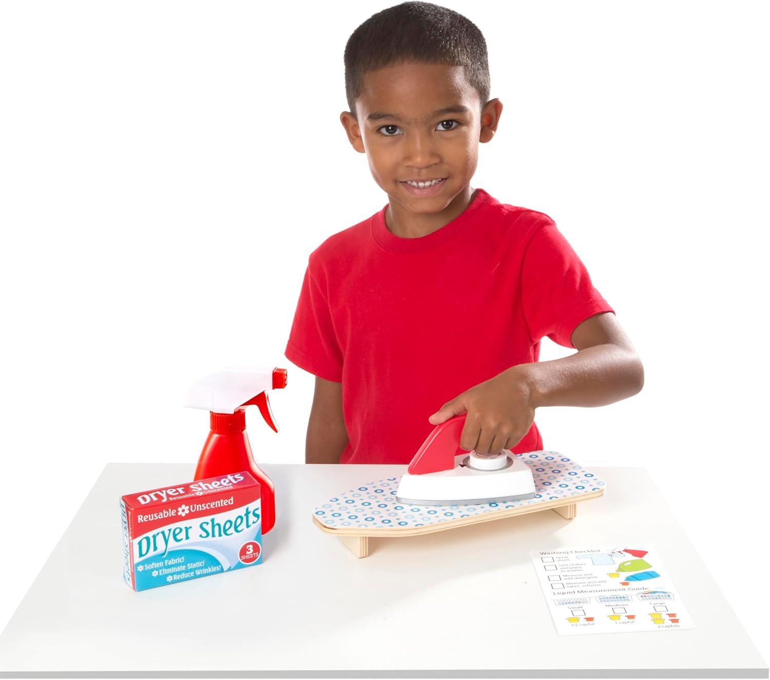 Kids will have loads of fun playing house with this these realistic laundry accessories! The 14-piece set includes a sturdy take-along basket to hold all the supplies and a reusable activity card to check off chores. Kids three and older will love spraying, measuring, and pressing with a stain remover spray bottle that can be filled with water, detergent and fabric softener bottles with removable lids, a box of three pretend dryer sheets, and a wooden iron and ironing board. Laundry day has never been such fun!
