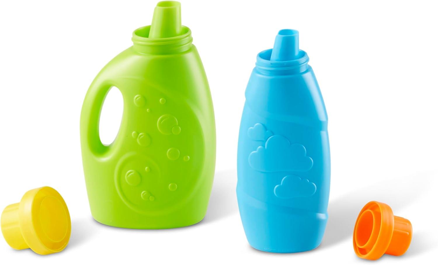 Includes box of three pretend dryer sheets, working spray bottle, detergent bottle and fabric softener bottle with removable lids for measuring