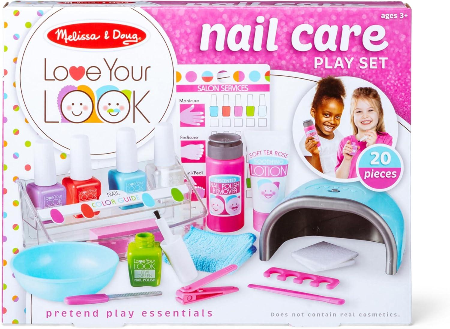 Perfect for mess-free imaginative play, THIS SET DOES NOT CONTAIN REAL NAIL POLISH OR OTHER COSMETICS. The 20-piece play set gives kids everything they need to give and receive pretend manicures and pedicures, with all of the fun and none of the mess! Start by “soaking” hands and feet in the durable bowl, use the empty tube with flip-top lid and the cloth to wipe dry and pretend to moisturize. There are realistic accessories to pretend to file, trim, clean up, and buff nails, and five play nail polish bottles with built-in brushes to “paint” nails! (Mess-free! Colored polish bottles do NOT contain nail polish.) Round out the nail salon experience with fun details like an empty “polish remover” pump bottle, toe spreader, and pretend nail dryer with LED light. Store and display items, including the reusable activity card, in the clear tabletop caddy with color chart! Role playing real-life experiences with Love Your Look play sets is a great way for kids three and older to build confidence, empathy, and self-esteem.