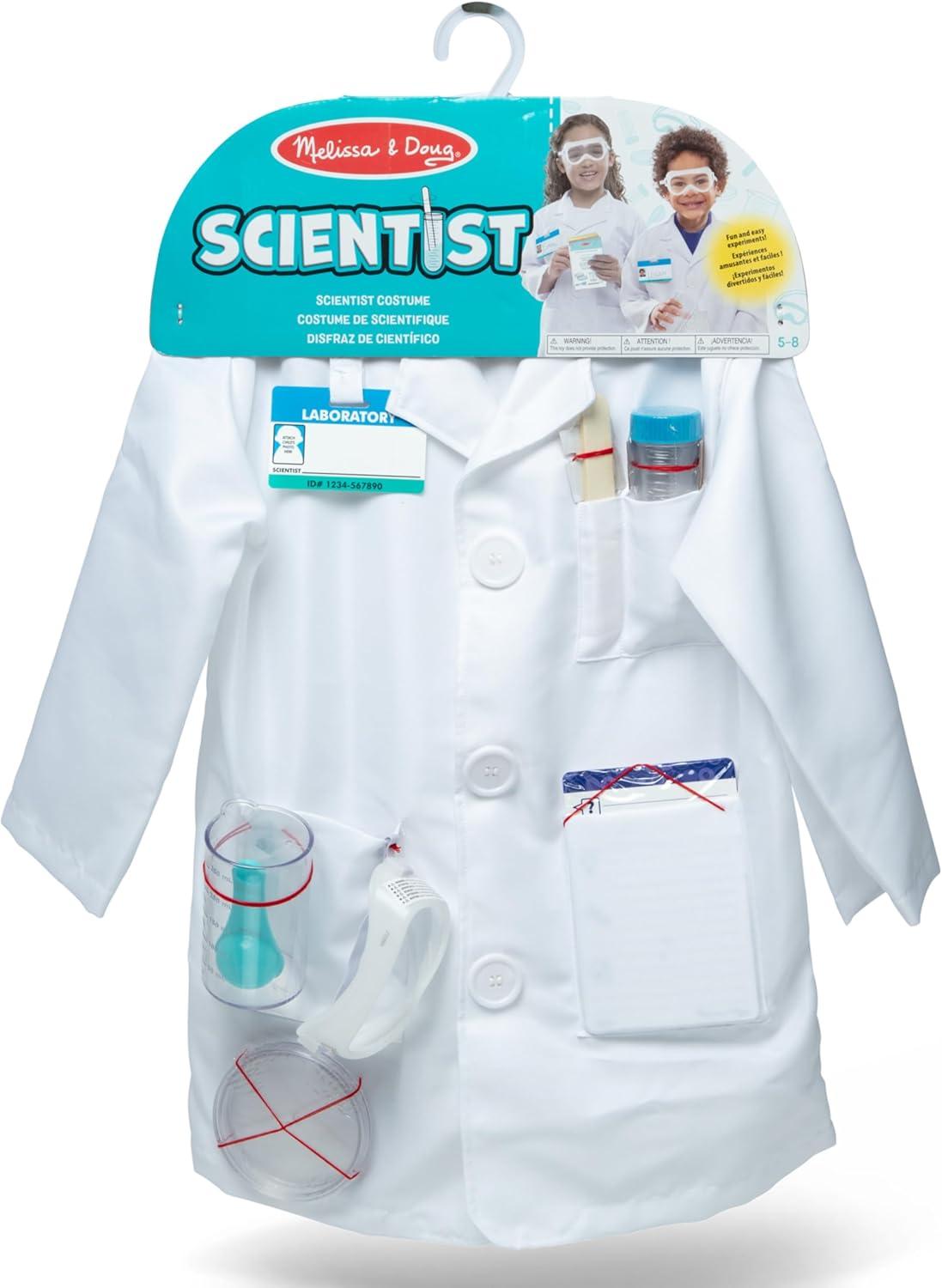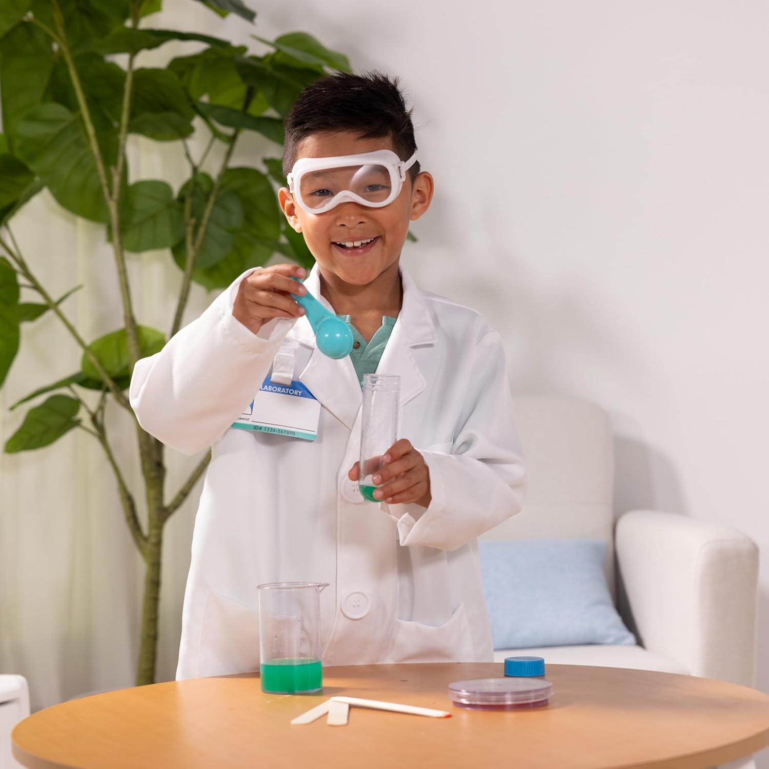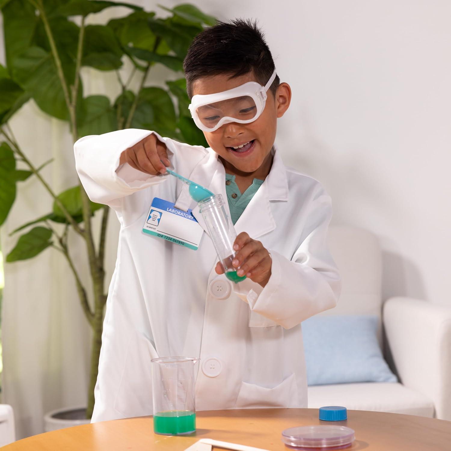 Includes lab coat, goggles, name tag, beaker, test tube, petri dish, measuring spoons, 6 experiment cards, hypothesis card