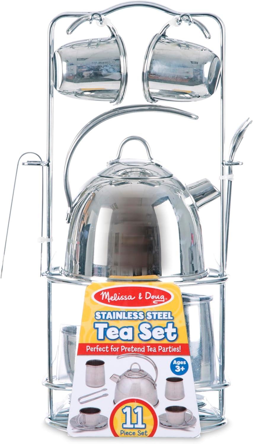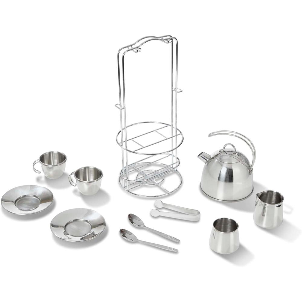Turn playtime into a special occasion with this shiny polished steel tea service play set! A stainless steel teapot with lid and two cups feature sturdy looped handles with riveted joints that won’t weaken or wear. Pretend to serve tea for two using the two saucers and teaspoons, a creamer, sugar bowl, and tongs for imaginary sugar cubes. All of the pieces are polished to a mirror-finish for an extra-fancy flair, and store on a handy metal storage rack. Kids three and older will love having imaginary tea parties with this special set!