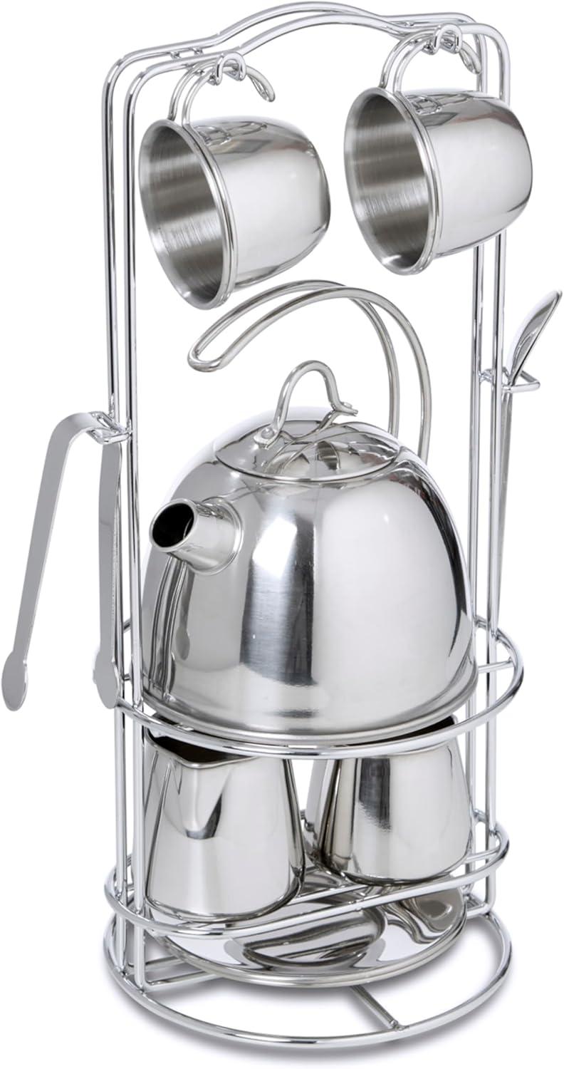 10-piece polished stainless steel children’s pretend play tea service for two with a shiny metal storage rack